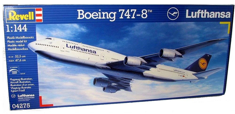 Revell 1/144 Boeing 747-8 Lufthansa. Dit model moet nog volledig worden gebouwd waardoor er verf en lijm benodigd is. Deze worden standaard niet bij het bouwpakket geleverd.
